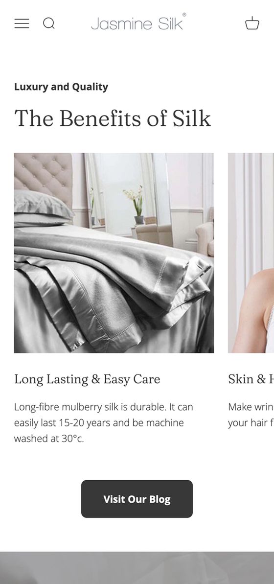 Alongside the technical migration, we completely reimagined Jasmine Silk’s online experience, delivering a modern, elegant design that celebrates the brand’s craftsmanship and attention to detail. We introduced a refined, neutral colour palette, clean typography, and spacious layouts to convey timeless luxury while improving usability across all devices. The website now mirrors the tactile quality and sophistication of Jasmine Silk’s products, making the online experience feel as premium as the product itself.