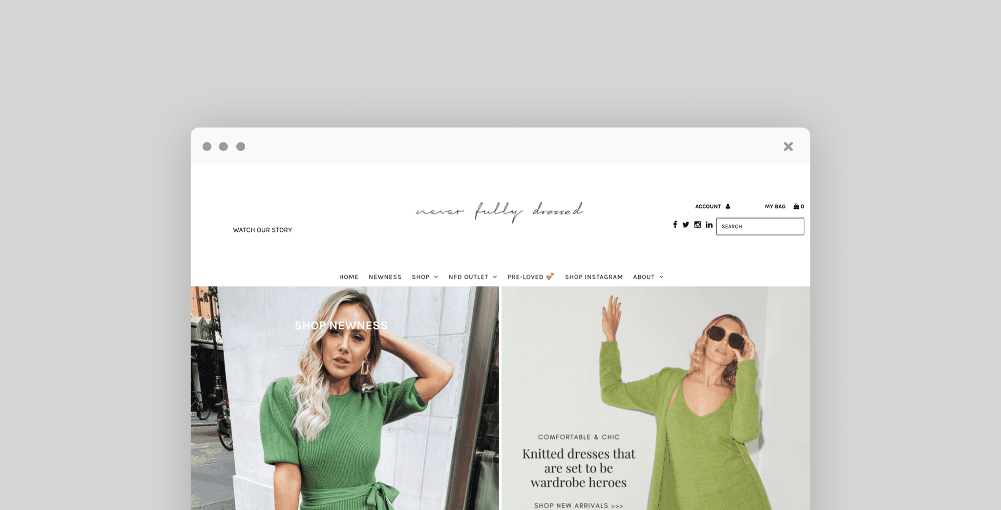 Never Fully Dressed is known for its strong social game, particularly on Instagram, so blubolt carefully selected the best partners for the new site. EmbedSocial delivers fresh and engaging Instagram stories to the homepage, while SNPT enables seamless shopping of the brand’s Instagram page.
