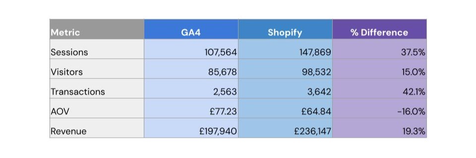 One of the most useful exercises when reviewing ecommerce performance is comparing GA4 data with Shopify data.